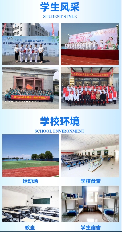 石家庄白求恩医学中等专业学校创办于1988年,前身为白求恩医学专修学院,是河北省教育厅直管的民办全日制学校,是5A级社会组织和河北省社会组织诚信建设先进单位,是白求恩精神教育基地。学校坚持以“珍爱白求恩品牌,以白求恩精神为灵魂建校育人”的立校之本,秉持“对社会负责、对家长负责、对学生负责”的理念,为社会培养了大批技术技能型医学人才。