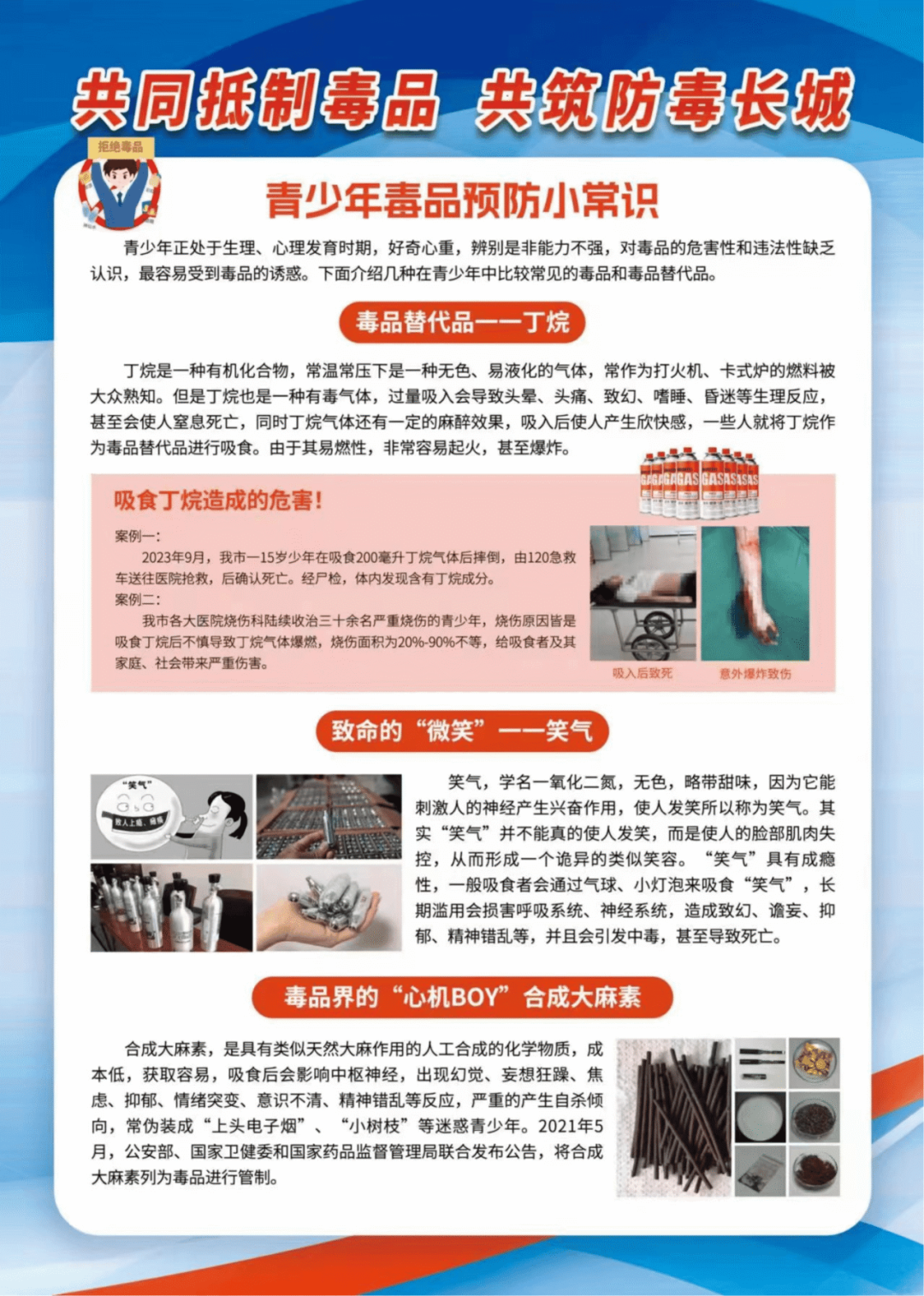特别是一些具有伪装色彩的新型毒品,如“笑气”、“上头电子烟”、“奶茶”、“邮票”、“彩虹烟”、“快乐水”等,对青少年学生极具迷惑性,此外,“盐酸曲马多”、“右美沙芬”、“阿普唑仑”等具有较强成瘾性的药物的滥用,在青少年学生人群中也并不罕见。这些“新型毒品”值得引起每一位同学的高度警惕。